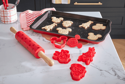 Bring the timeless aesthetic of Disney's early-era black-and-white animated masterpieces to your kitchen. Create your dream space and add a pop of pattern with our Mickey Mouse inspired cookware and accessories collection.